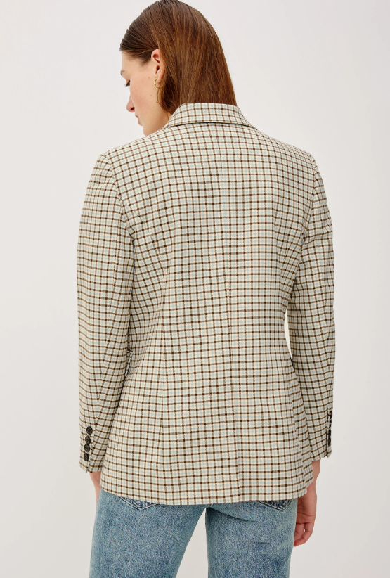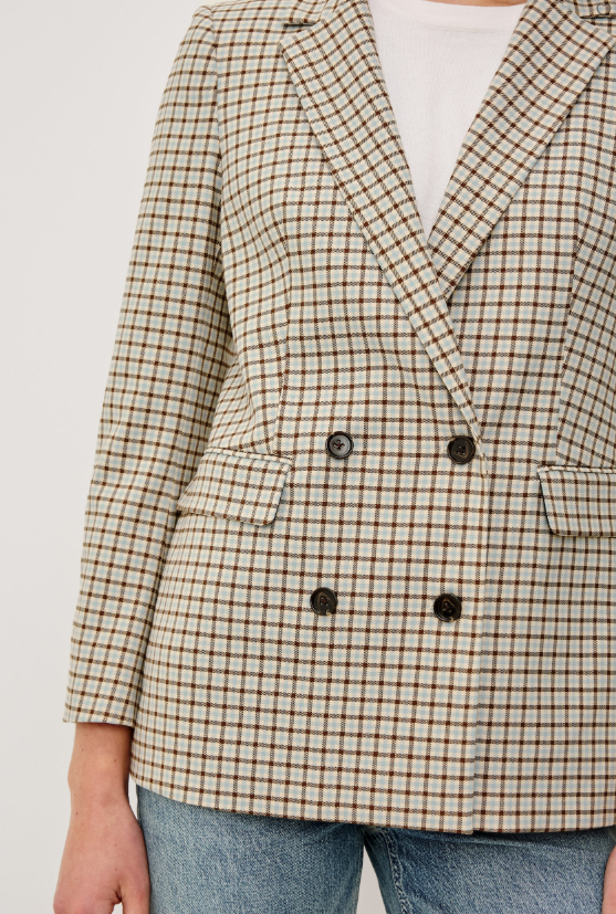 The Jac is a double-breasted blazer with a notched lapel, side flap pockets, long sleeves, and a fully lined interior.